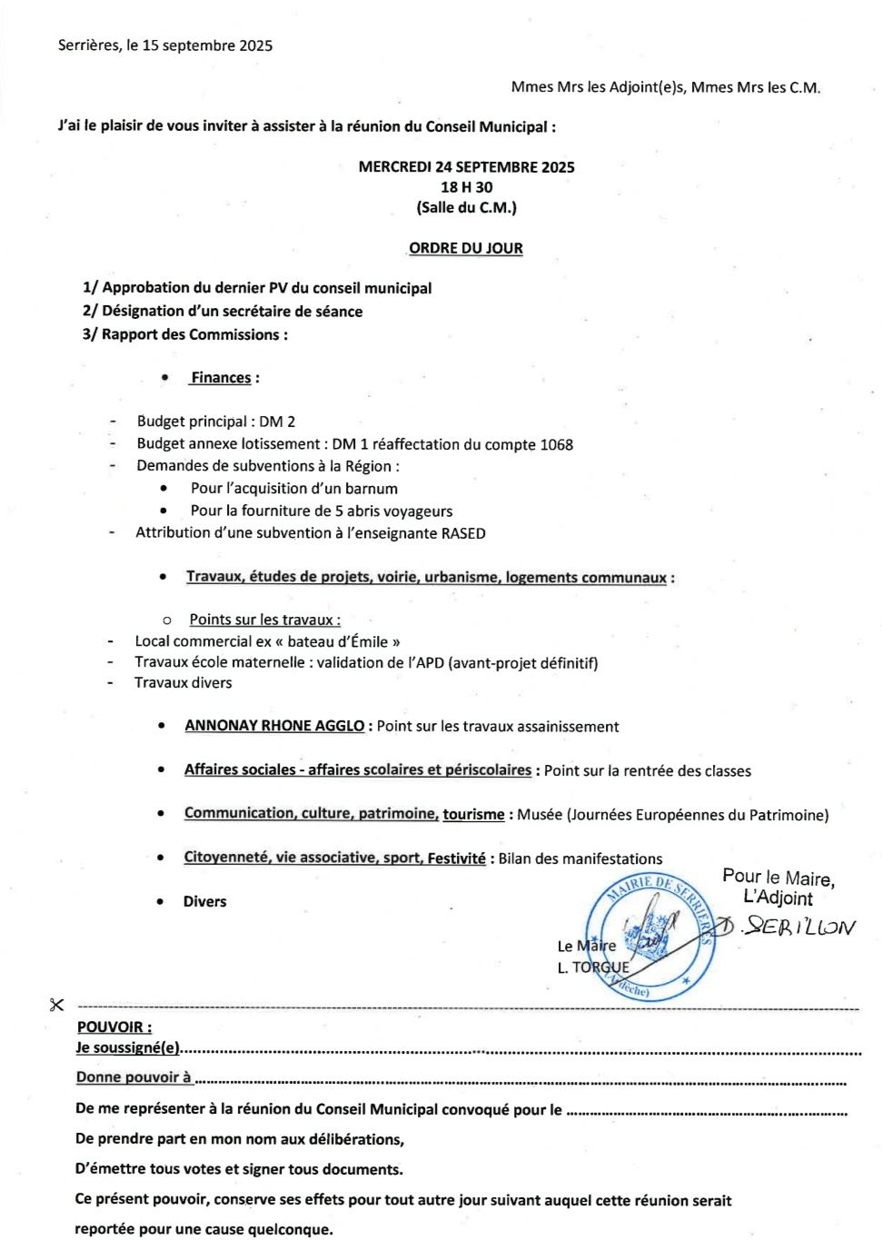 La prochaine séance du conseil municipal aura lieu le 24 septembre à 18 h 30 à la salle des mariages.