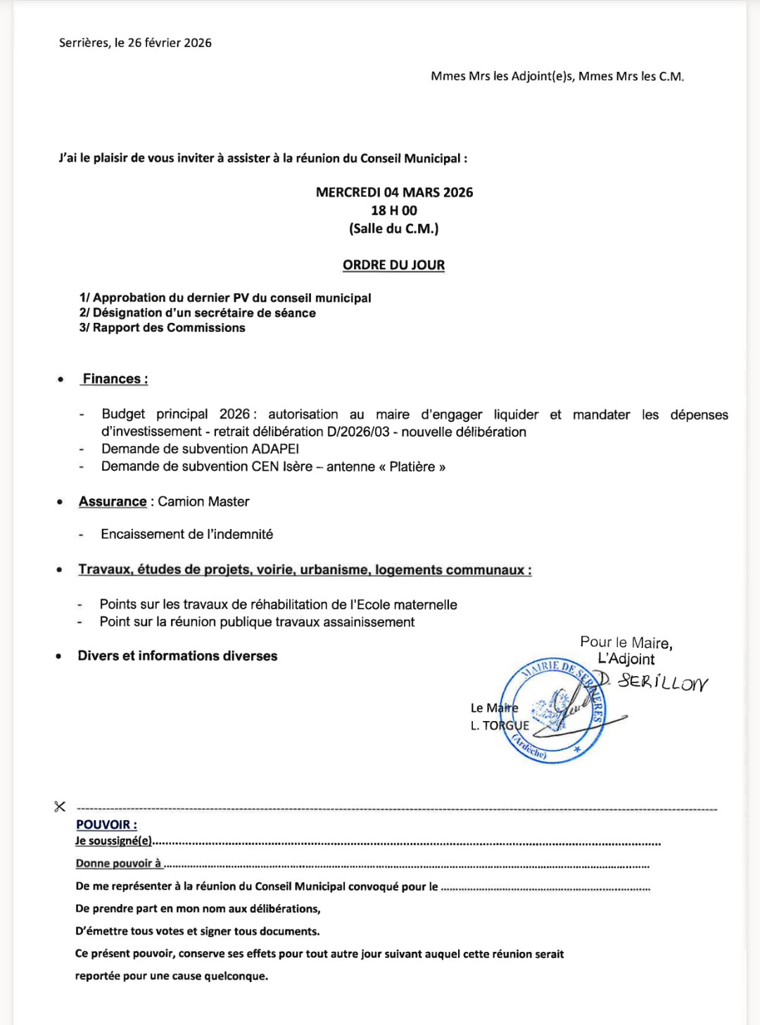 Prochain conseil municipal 04/03/2026